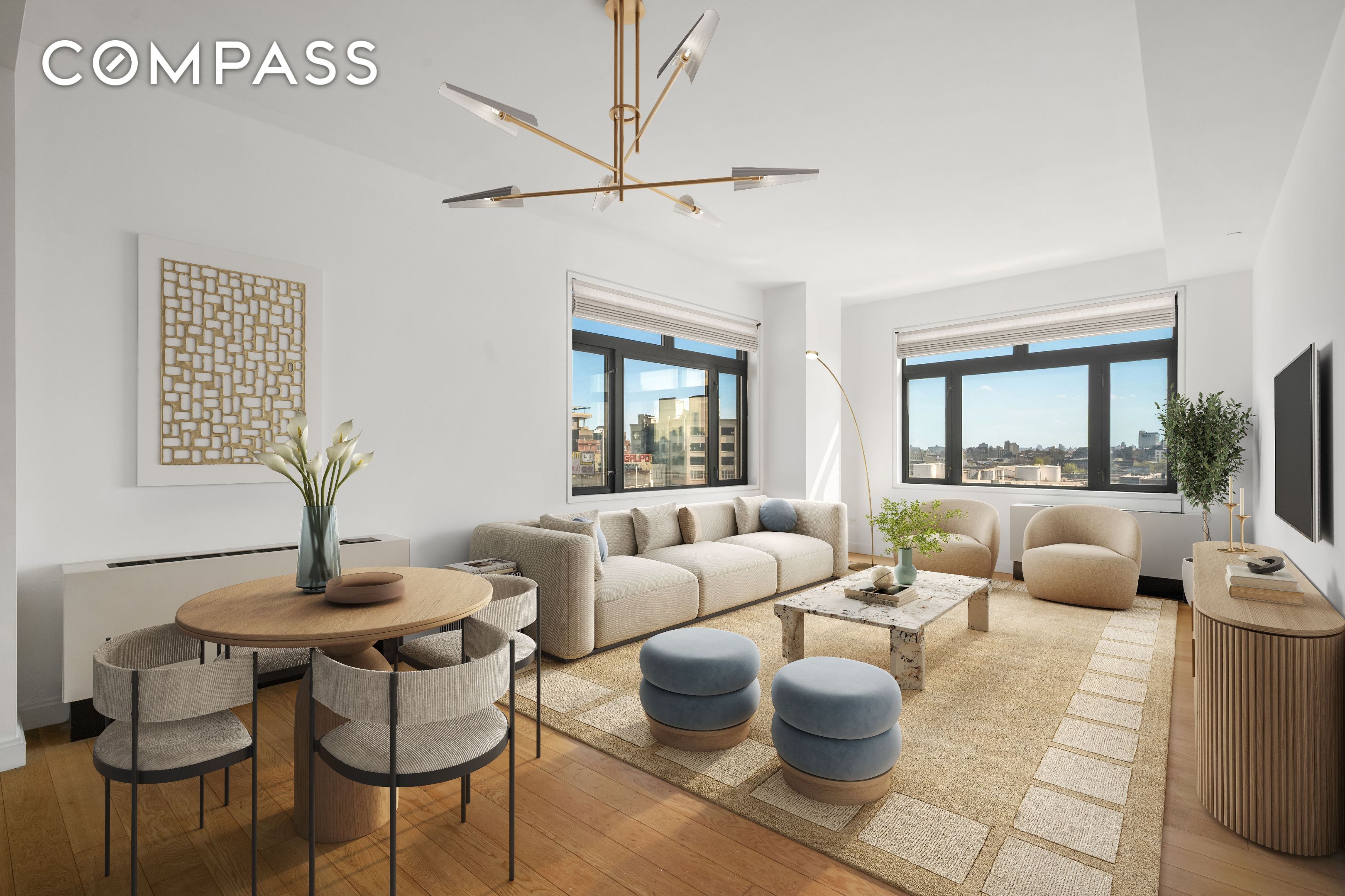 With both South and East exposures, Residence #5i is a sun-filled premium 2 bedroom/2-bathroom condominium offering open panoramic views of lower Manhattan and Brooklyn skylines. The functional corner layout, clean lines and quality details showcase this modern home: a true entrance foyer with large coat closet, hardwood flooring, separate laundry closet with Bosch washer/dryer, individual HVAC units in each room, and windowed kitchen with stainless steel backsplash and gloss finish cabinetry. The contemporary chef's kitchen features stainless steel appliances, a large counter space with breakfast bar, and the rare and wonderful window.
