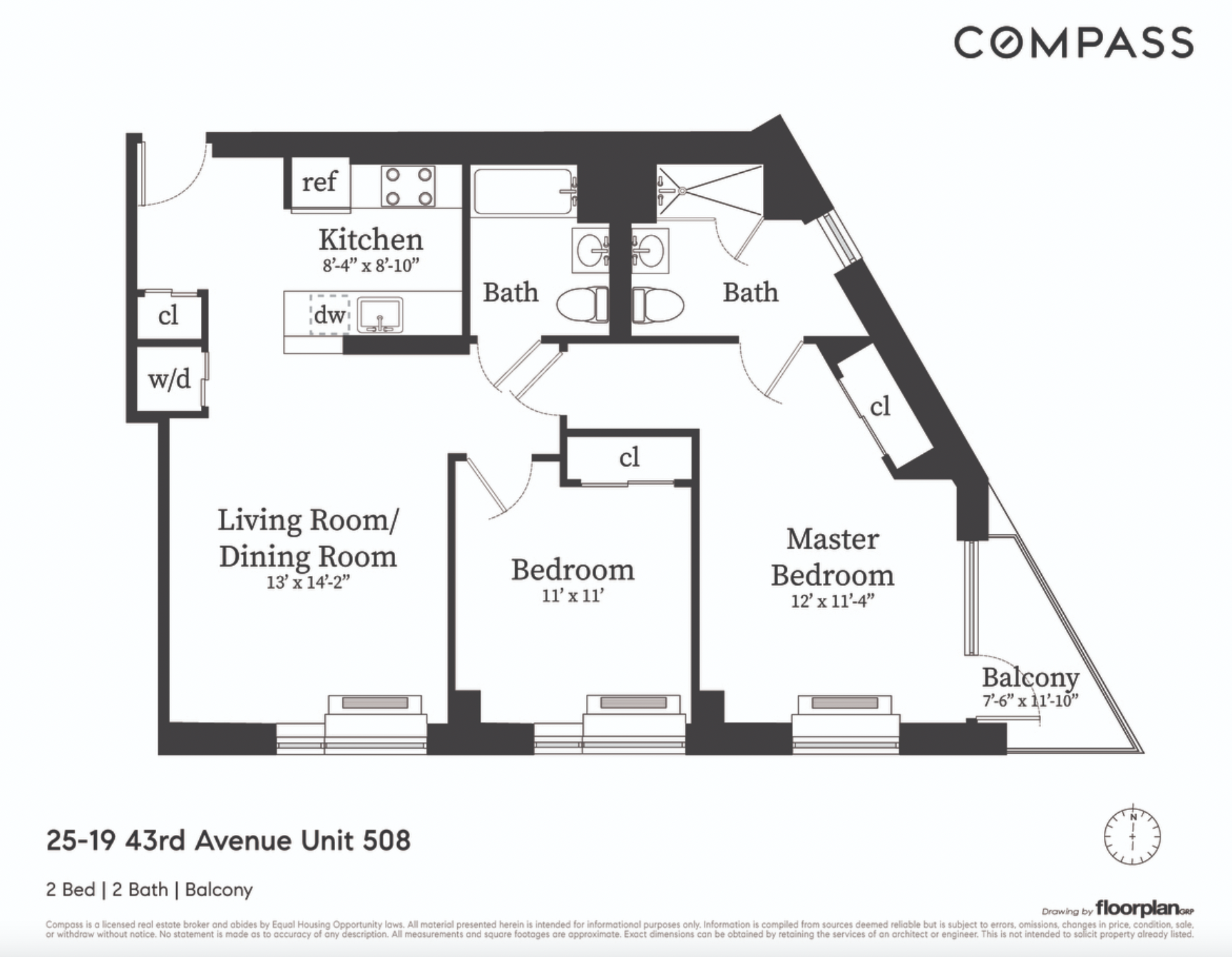 Unit 508 boasts tons of natural light with oversized double pane windows and ceiling heights reaching nearly 10' high. Complete with wide plank oak hardwood flooring and the convenience of washer/dryer in the unit. A bright and airy ambiance welcomes you into this spacious 1,046-square-foot home featuring gorgeous wide-plank oak floors and soaring 10-foot-tall ceilings. Relax and entertain in the open plan living and dining area. The thoughtfully designed modern kitchen is finished with quartz stone counters and island, a tiled snow & ice backsplash equipped with a full suite of stainless-steel appliances including a gas range, dishwasher, and built-in microwave. The bathrooms are complete with high style stone gray tiled floors and polished white stone walls featuring chrome Waterworks fixtures and a custom vanity. Residents can also enjoy the stunning private balcony with open LIC views. The main bedroom suite is efficiently laid out where you can easily set up a king-size bed along with additional furniture and a home office. The impressive en-suite spa bathroom features a frameless walk-in shower and handsome tiling. The large secondary bedroom is well appointed with ample closets and storage throughout the residence.